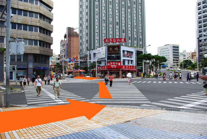 駅の階段を下り、正面にみえるスクランブル交差点を斜めにわたり、国際通りに入ります。