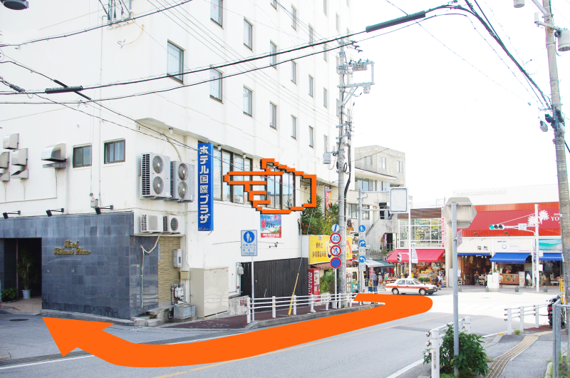 真っ直ぐ5分ほど歩くと、当ホテルの看板が見えるので、交差点を右に曲がって下さい